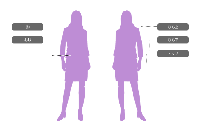 ひじ上 / ひじ下 / 胸 / お腹 / ヒップ