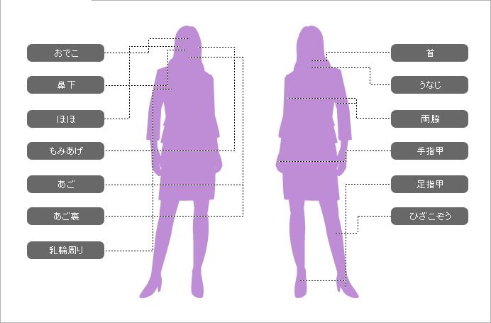 脇 / 鼻下 / あご / あご裏 / ほほ / もみあげ / おでこ / うなじ / 手指甲 / 足指甲 / 乳輪周り / ひざこぞう